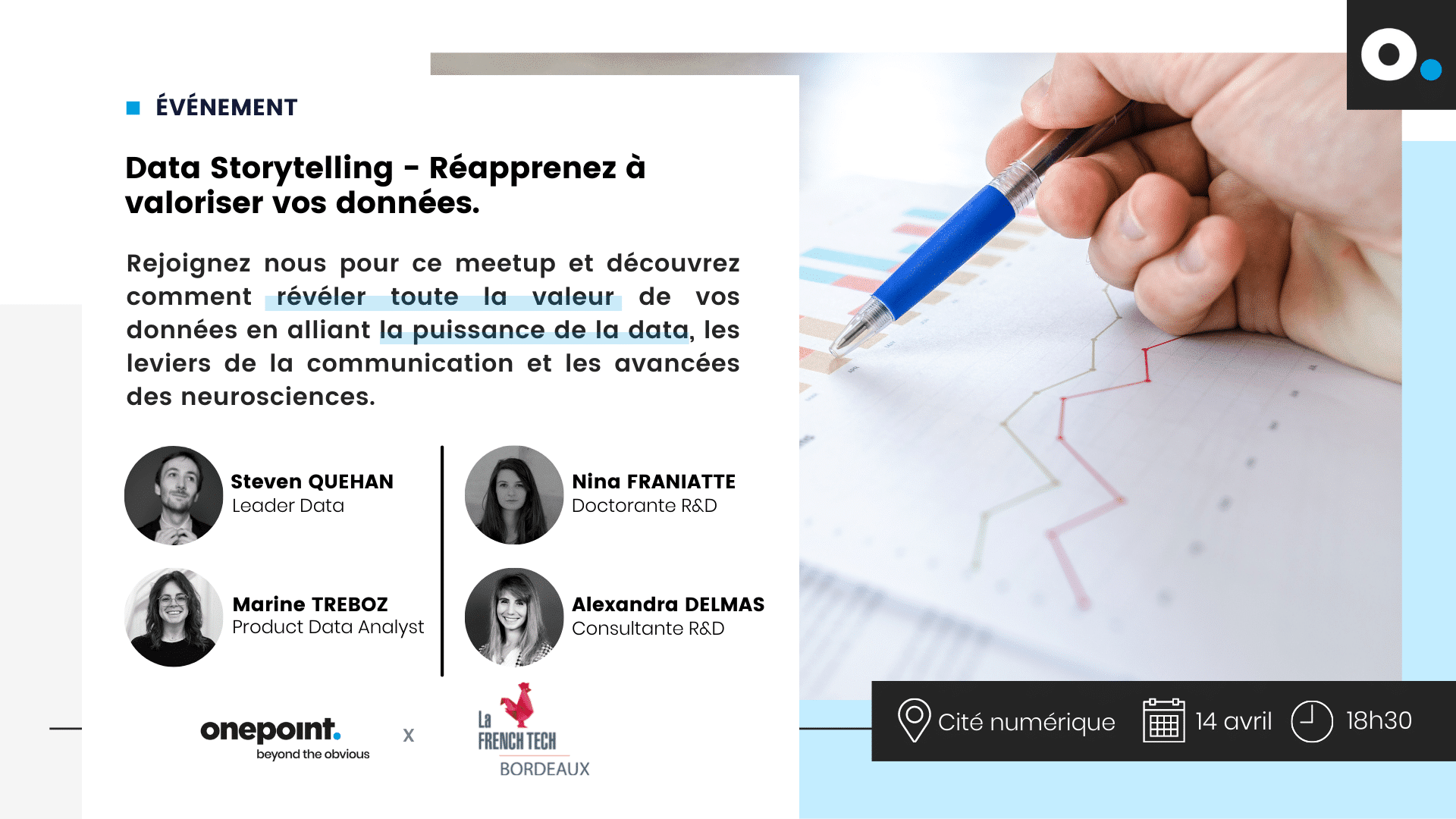 Christelle Nedelec, leader chez onepoint vous invite à la Cité Numérique à Bègles pour un nouveau meet-up sur l’importance l’utilisation de la données dans vos projets, en partenariat avec la French Tech Bordeaux. Rendez-vous le 14 avril à 18h30 à la Cité Numérique à Bègles pour découvrir comment révéler toute la valeur de vos données en alliant la puissance de la data, les leviers de la communication et les avancées des neurosciences.