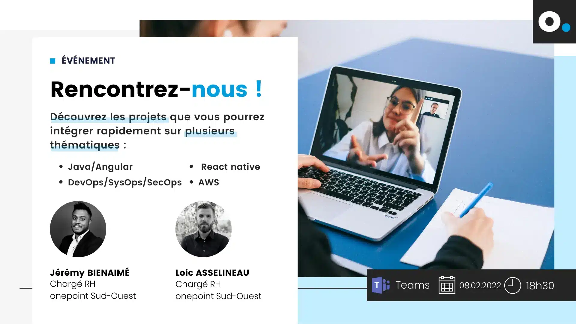 Rencontrez Jérémy Bienaimé et Loic Asselineau, nos Chargés RH onepoint à Bordeaux vous proposent un moment de partage et d’échange, mardi 8 février à partir de 18h30.