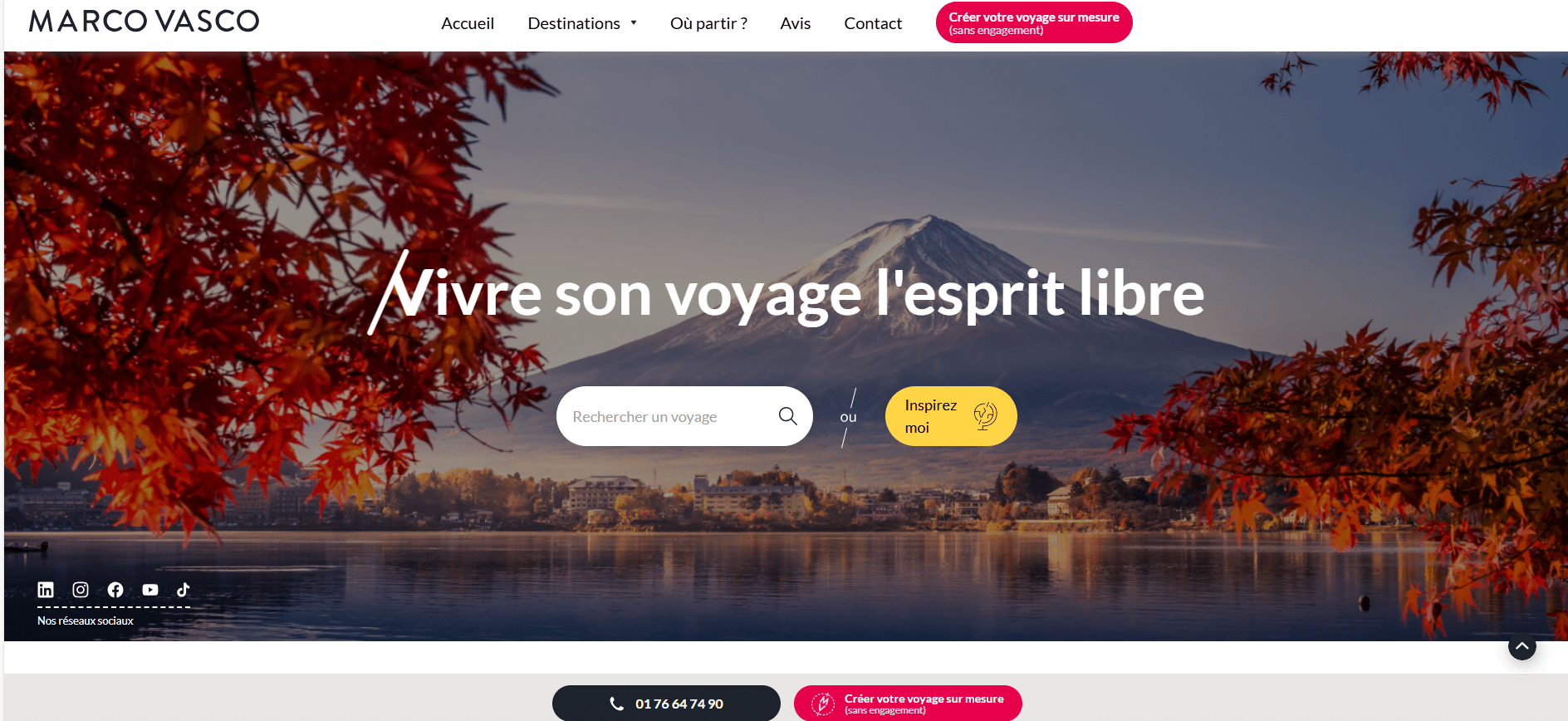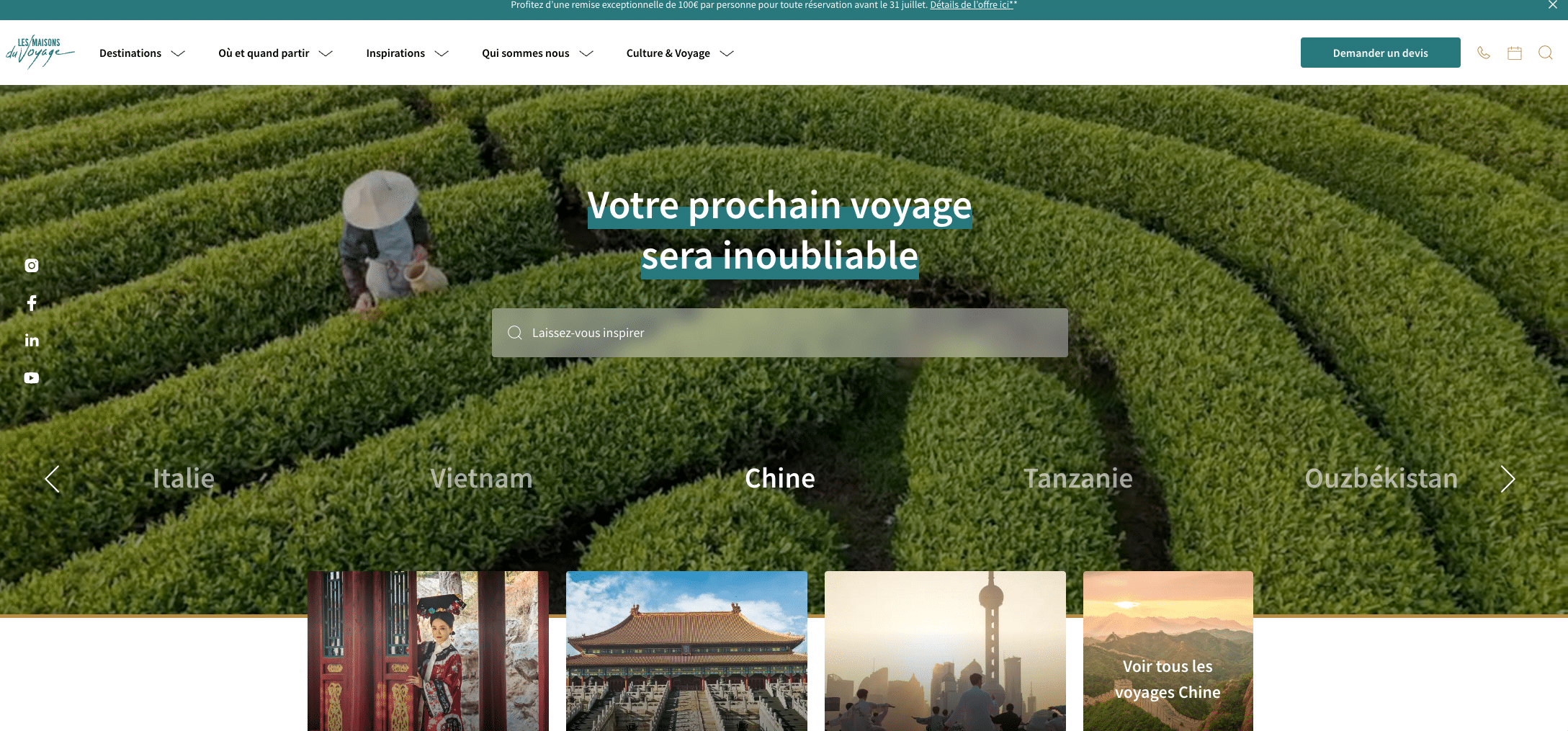Fort de près de 300 collaborateurs, MARCO VASCO et Les Maisons du Voyage unissent leurs expertises pour proposer des voyages d’exception sur-mesure vers 70 destinations. Leur engagement : allier le haut de gamme, la personnalisation et la durabilité.