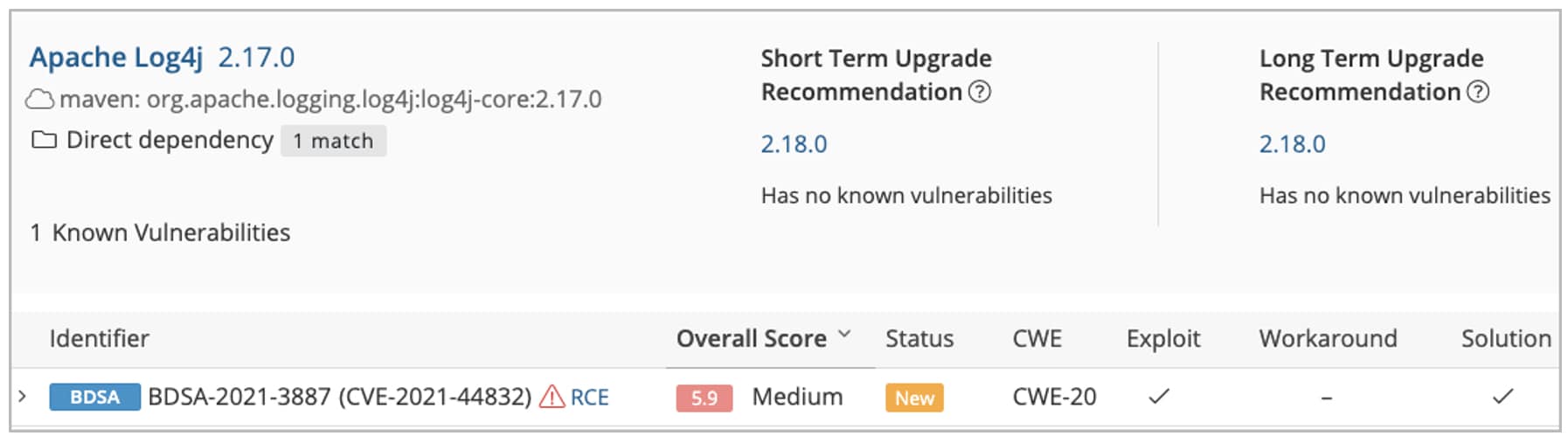 La vulnérabilité Log4j identifiée par le SCA BlackDuck, avec son identifiant interne (BDSA) et standard (CVE)