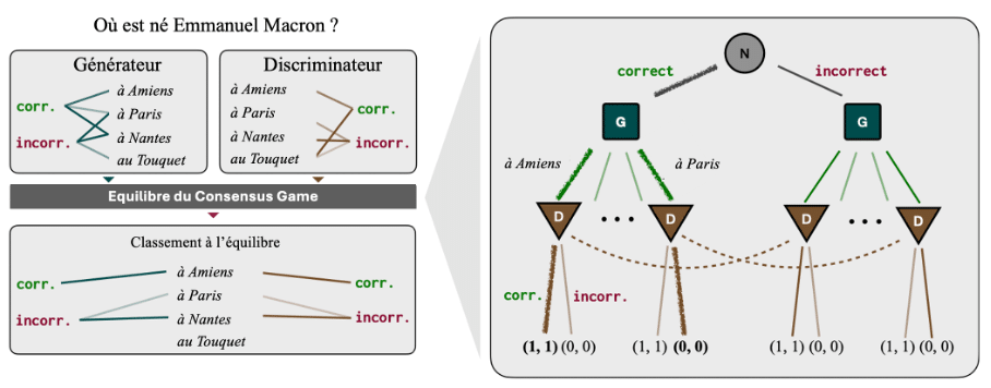 L’article qui propose le Consensus Game envisage deux manières de poser une même question factuelle x à un LLM. La première consiste à formuler la question x accompagnée d’une liste Y = {y1, y2, … yk} de réponses possibles. Cette question x pourrait être p.ex. « Où est né Emmanuel Macron ? » et la liste Y pourrait être {« Paris », « Le Touquet », « Amiens », « Nantes »}. Plus explicitement encore, le prompt soumis au LLM pourrait être p.ex. : « Parmi les villes suivantes : Paris, Le Touquet, Amiens et Nantes, laquelle est le lieu de naissance de M. Macron ? ». En interne le LLM calcule alors une distribution de probabilité sur les 4 réponses possibles, notons-la PG(y|x), et la réponse qu’il donne correspond naturellement à la ville y* qui maximise PG(y|x). Ce premier mode d’interrogation est dit génératif. Le second mode consiste à proposer un couple question-réponse (x,y) et à demander si une réponse, p.ex. y = « Nantes », est plausible si la question est x. Explicitement, le prompt soumis pourra être « Est-ce que le lieu de naissance de M. Macron est Paris ? ». Le LLM calculera là encore une distribution sur les deux valeurs de vérité v= « correct » ou v = « incorrect », notons la PD(v|x,y), et retournera celle qui a la plus grande probabilité. C’est le mode discriminant du LLM.