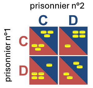 Un autre jeu bien connu est celui du dilemme du prisonnier. Il modélise une situation dans laquelle deux individus ont intérêt à coopérer car c’est l’issue qui maximise la somme de leurs gains. Cependant si un seul des deux choisit de le faire il sera fortement pénalisé. Dans la formulation traditionnelle deux criminels complices sont détenus dans des cellules distinctes et ne peuvent pas communiquer. Les actions possibles pour eux correspondent au choix de se taire (C) ou d’avouer leur crime (D), voir la figure 3. Coopérer signifie que les deux se taisent (C,C). Dans ce cas ils se verront infliger une peine réduite faute d’éléments à charge. C’est la situation globalement la plus favorable. Si en revanche seul l’un des deux choisit de trahir et avoue le crime, il se verra infliger une peine minimale alors que son camarade se verra infliger une peine maximale. Ce sont les issues (C,D) et (D,C). Si enfin tous les deux avouent le crime (D,D), ils seront condamnés à des peines légères. Cette situation (D,D) bien que globalement moins favorable que la coopération (C,C), a toutefois de bonnes chances d’être choisie par nos deux lascars s’ils agissent rationnellement car ils n’auront en effet aucune raison de regretter leur choix. Le prisonnier n°1 peut se dire qu’il a bien fait d’avouer puisque s’il avait gardé le silence il aurait subi la peine maximale, de même pour le prisonnier n°2. Cette situation dans laquelle aucun des joueurs n’a de raison de regretter son choix est un exemple de ce qu’on appelle un équilibre de Nash.