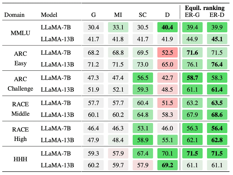 Une fois l’équilibre (P*G,P*D) du Consensus Game atteint, on peut utiliser la prédiction du générateur P*G(y|x,v=correct) ou celle du discriminateur PD(v=correct|x,y) pour déterminer une la réponse y cohérente la plus probable à une question x. Cette réponse se substitue à la réponse déduite de la distribution initiale du LLM initialement déduite de PG(y|x, v=correct). Pour évaluer l’efficacité du Consensus Game les auteurs de [1] ont utilisé 6 datasets de référence (MMLU, ARC, …, HHH) pour le problème de question-answering et comparé la précision des réponses obtenues avec leur méthode (ER-G) et (ER-D) à celles fournies par le LLM non corrigé (noté G dans le tableau) et par d’autres méthodes plus anciennes (notées MI, SC, D).