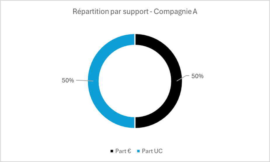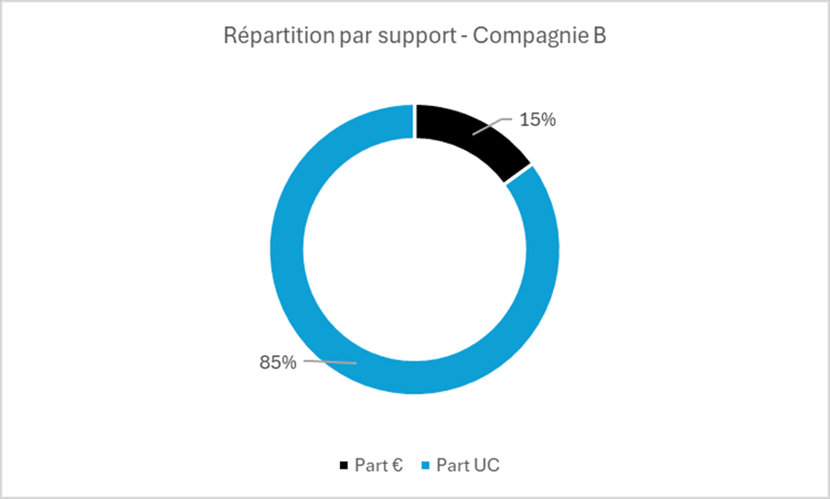 La compagnie B a développé une offre privilégiant les unités de compte (supports d’investissement plus dynamiques), qui constituent 85% de son activité. (© Schéma Onepoint, 2025)