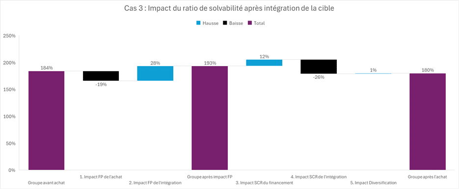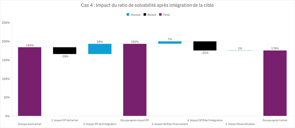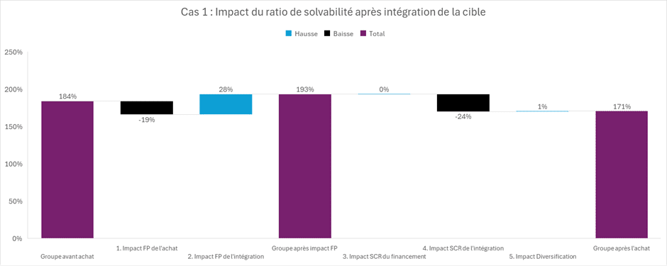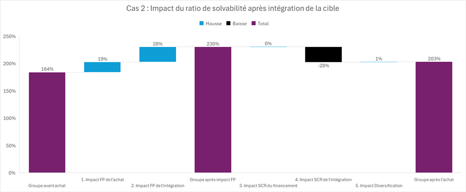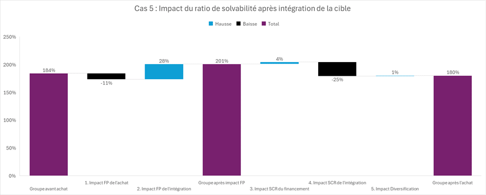 Dans cette configuration, le ratio atterrit à 180 %, soit une baisse de -4 %. La compagnie A est alors capable de financer l’achat de B tout en maintenant son ratio de solvabilité dans le corridor cible.