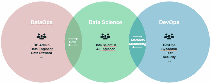 À l’issue de la phase exploratoire réalisée au sein de l’équipe Data Science, ce modèle doit être mis en production pour générer de la valeur. Le prototype doit alors évoluer, d’une réalisation de l’équipe de Data Science seule (un algorithme optimisé pour sa performance mathématique), au produit d’une collaboration nécessaire entre différents acteurs : DataOps, Data Science, DevOps, ainsi que les métiers – ceux pour qui le modèle génère de la valeur.