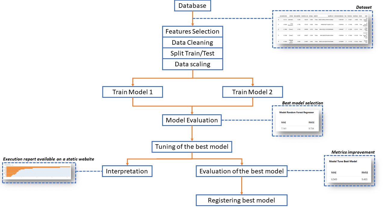 Pour répondre à toutes ces questions, l’automatisation apparaît alors comme la seule réponse possible. Nous avons donc segmenté l’ensemble des actions de notre code exploratoire en étapes logiques (extraction des données, préparation des données, entrainement du modèle, évaluation du modèle, rapport d’interprétation, enregistrement du modèle), déployées et orchestrées par un pipeline – en l’occurrence, Microsoft Azure ML (d’autres outils existent). Le schéma ci-dessous représente toutes ses étapes, mises en place dans le cadre du projet de prédiction de popularité. »