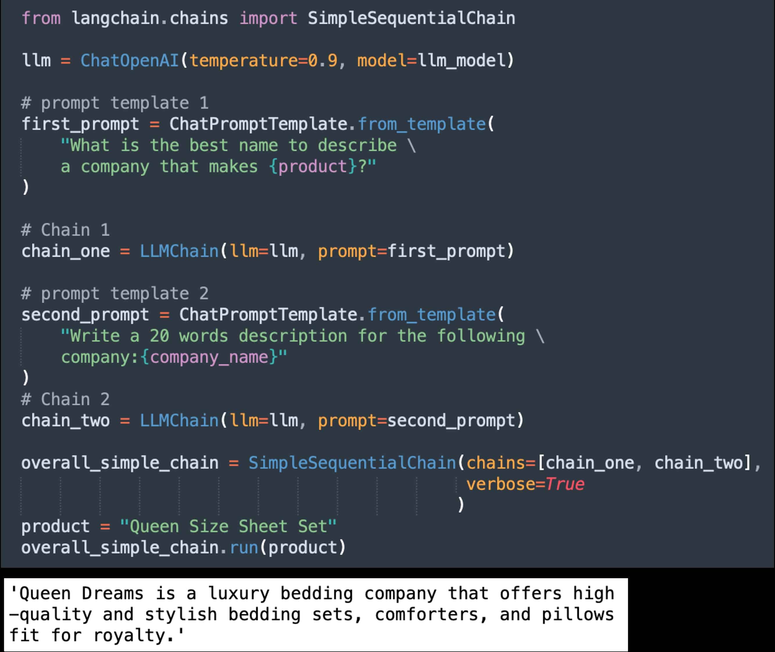 La SimpleSequentialChain transmet la sortie d’un LLM (ou d’un autre module) à l’entrée du module suivant dans une séquence. Voici un exemple où le premier LLM est celui défini précédemment (qui imagine le nom d’une entreprise à partir d’un produit) et où le second est chargé de produire une courte description de l’entreprise à partir de son nom :