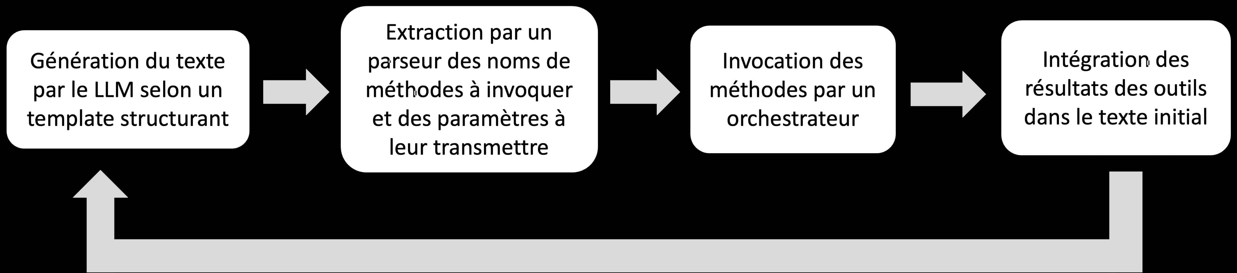 Chaque exemple d’invocation d’outil dans le prompt est désigné par le nom d’une méthode à utiliser et par la liste des paramètres à lui transmettre. L’utilisation d’un formatage rigoureux des exemples est recommandée pour faciliter la tâche des parseurs chargés d’analyser syntaxiquement la réponse produite. Une fois que les outils ont produit leurs réponses celles-ci sont incorporées à l’historique de la conversation qui sera retransmis au LLM qui poursuivra la génération jusqu’à la vérification d’un critère d’arrêt.